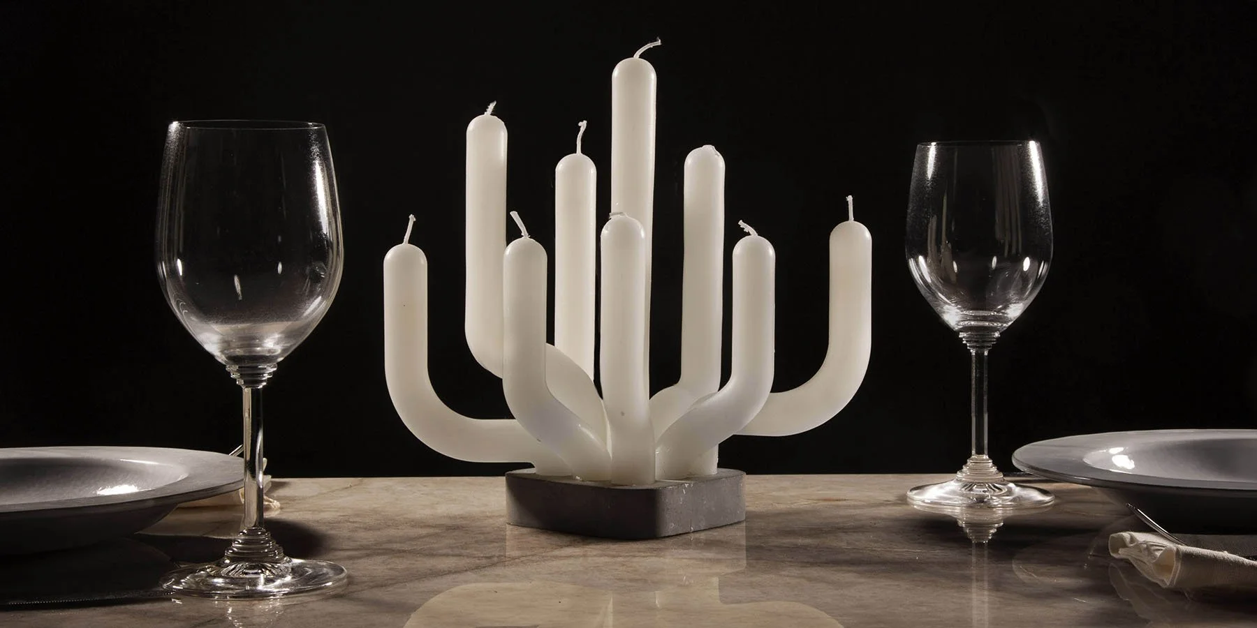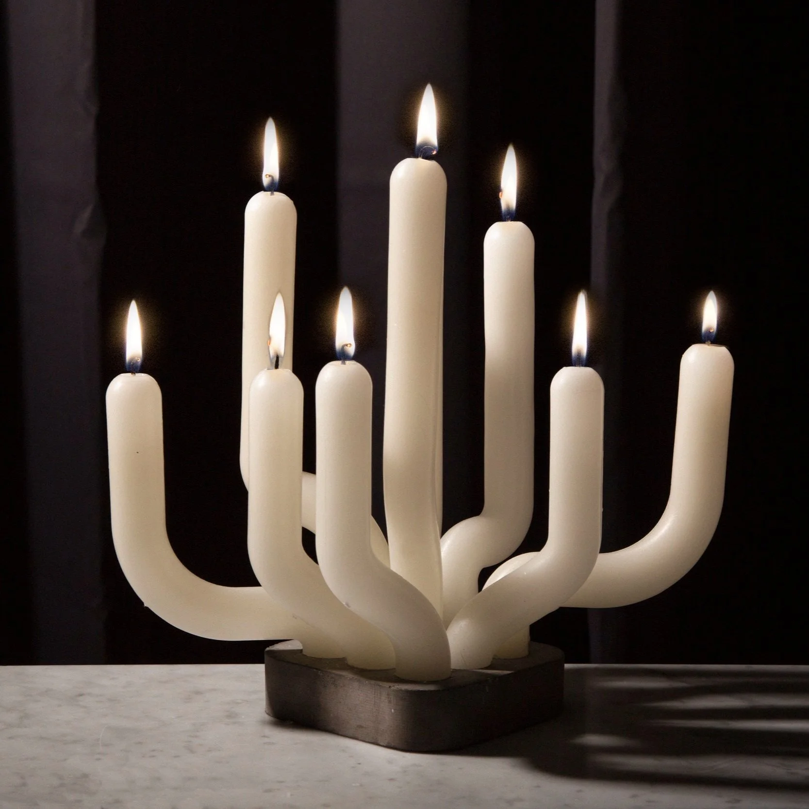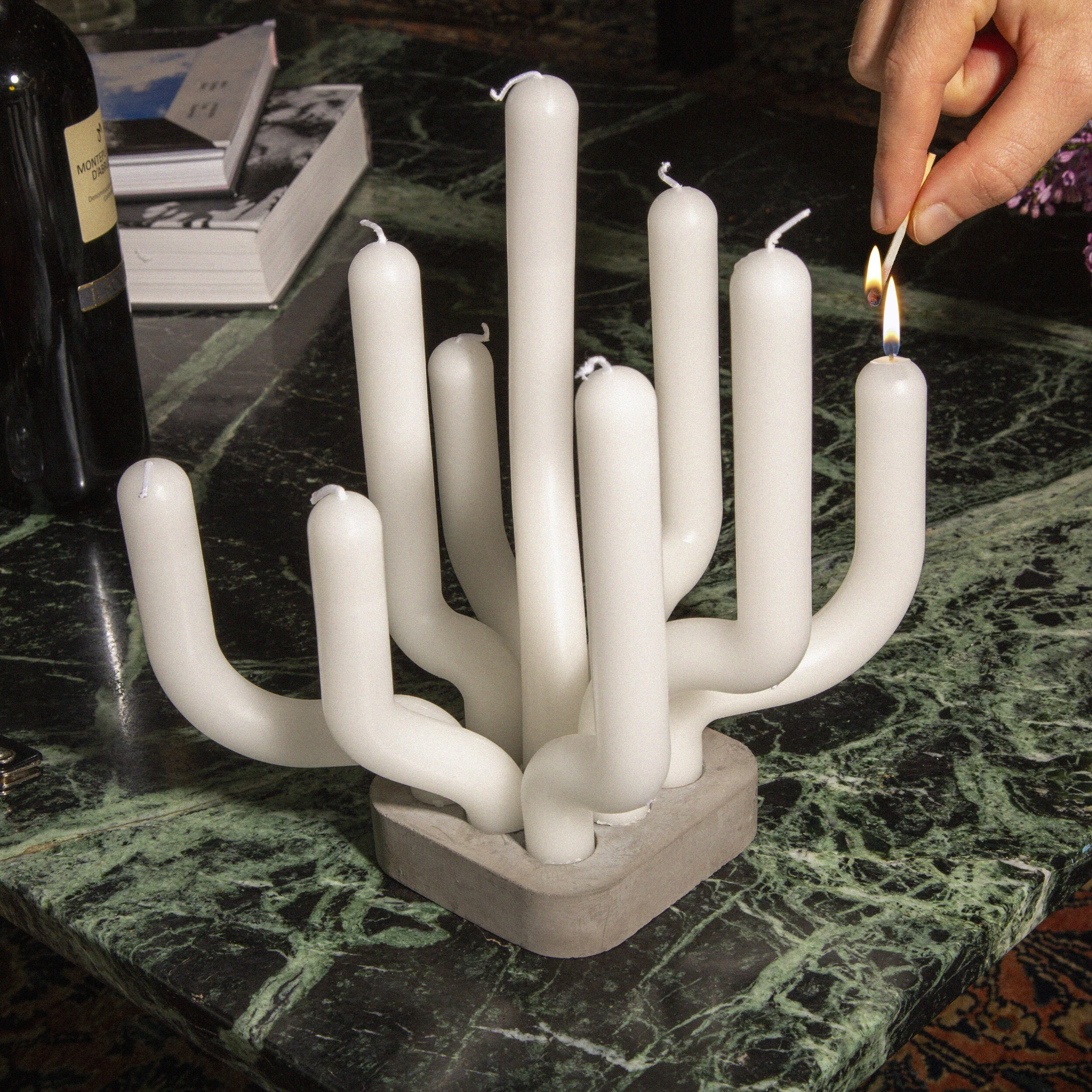 The candle is constructed with a concrete base and 9 removable candles. The box comes flat packed, and the user is able to assemble the candles in any arrangement they wish.