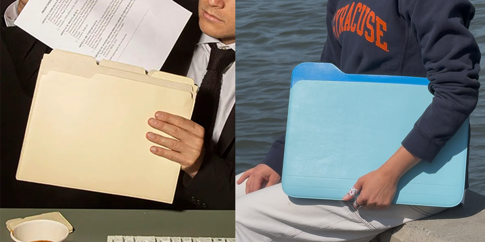 The purse and wallet that look like a manila folder. Why not try to reimagine the manila folder’s purpose into something a little more exciting! It is an object that is slowly going out of use. Why not repurpose the shape?