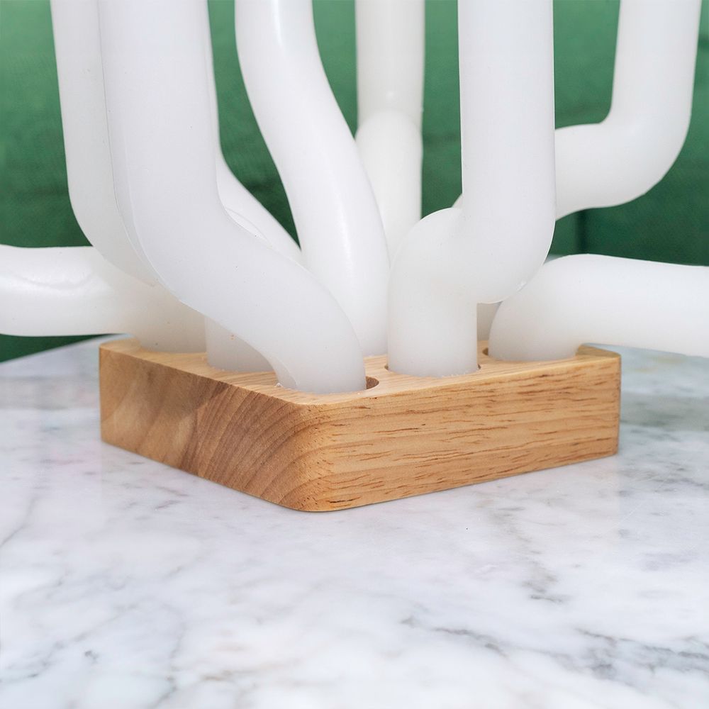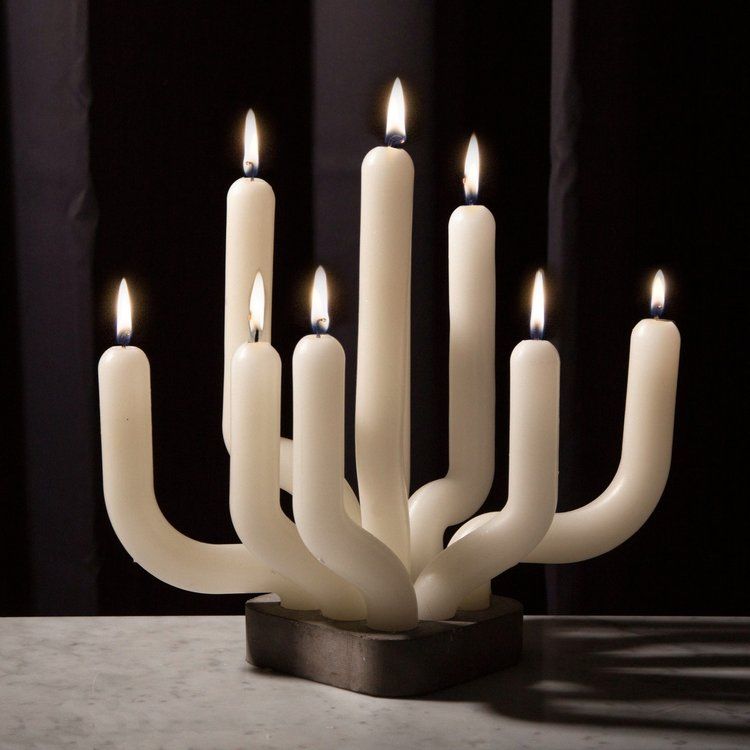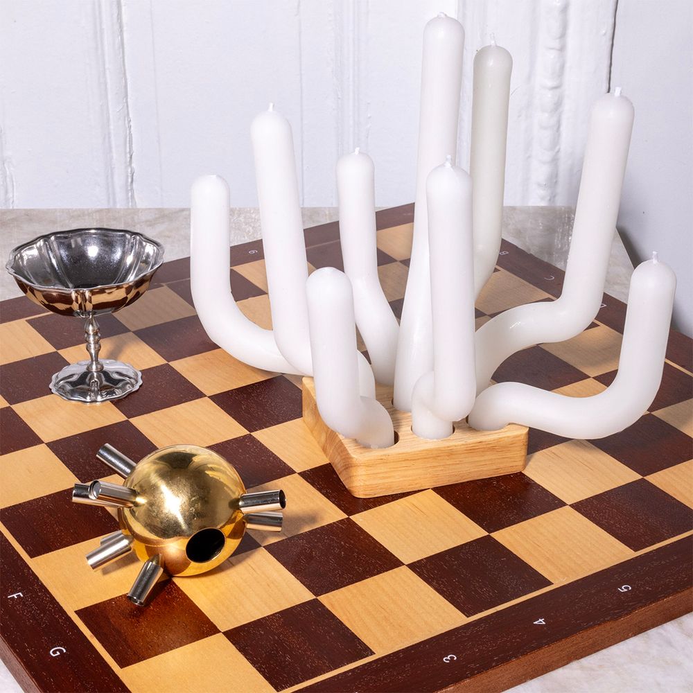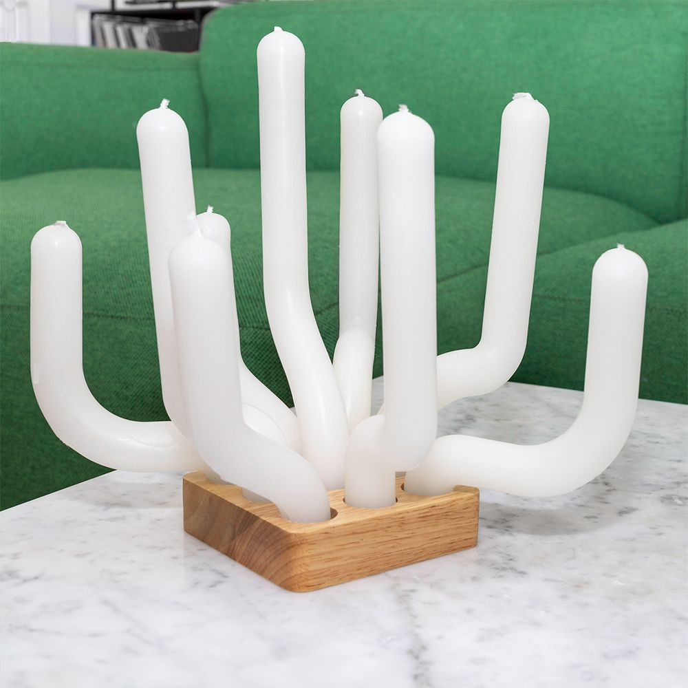 A candelabra inspired by blooming flora. Available for purchase with a natural wood or painted blue base. Limited edition of 100.
