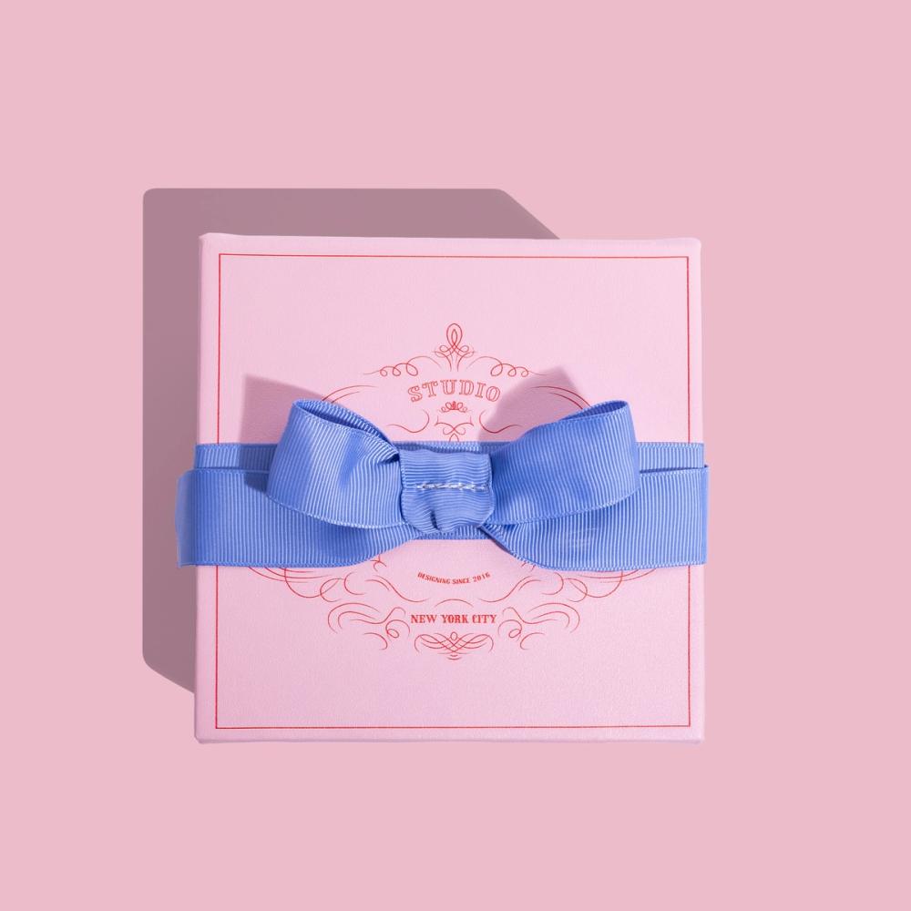 Flexible and soft mid-length strap matches the decorative bow on top of the box.