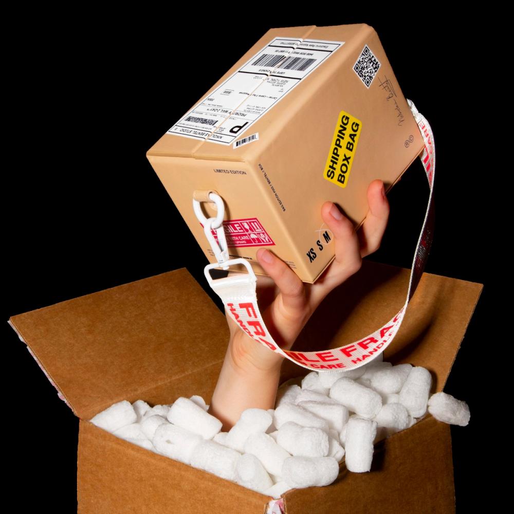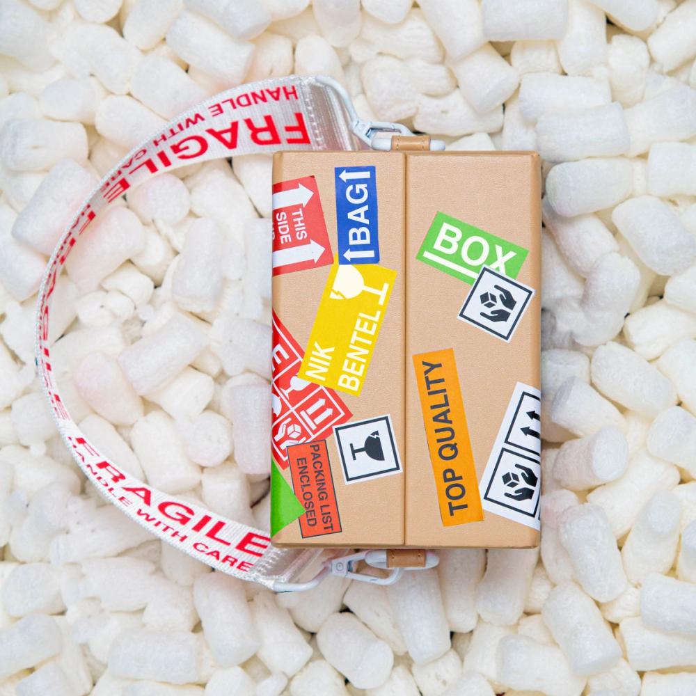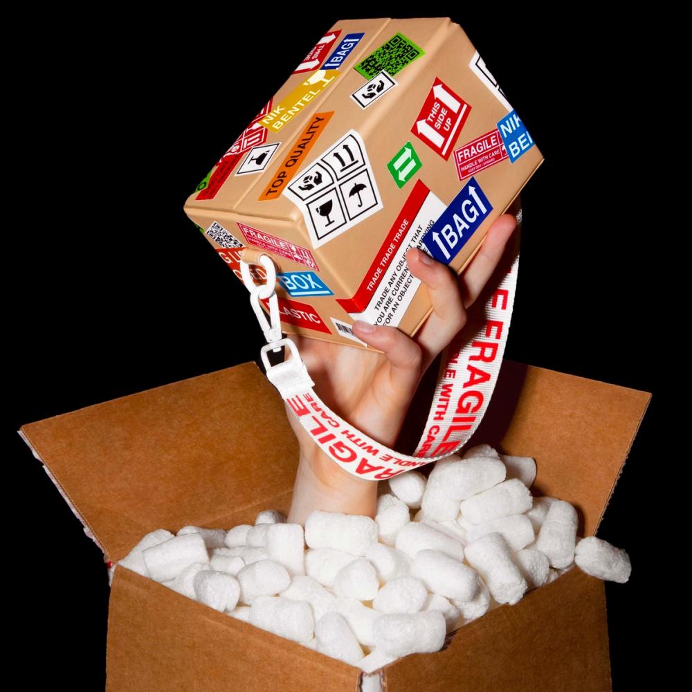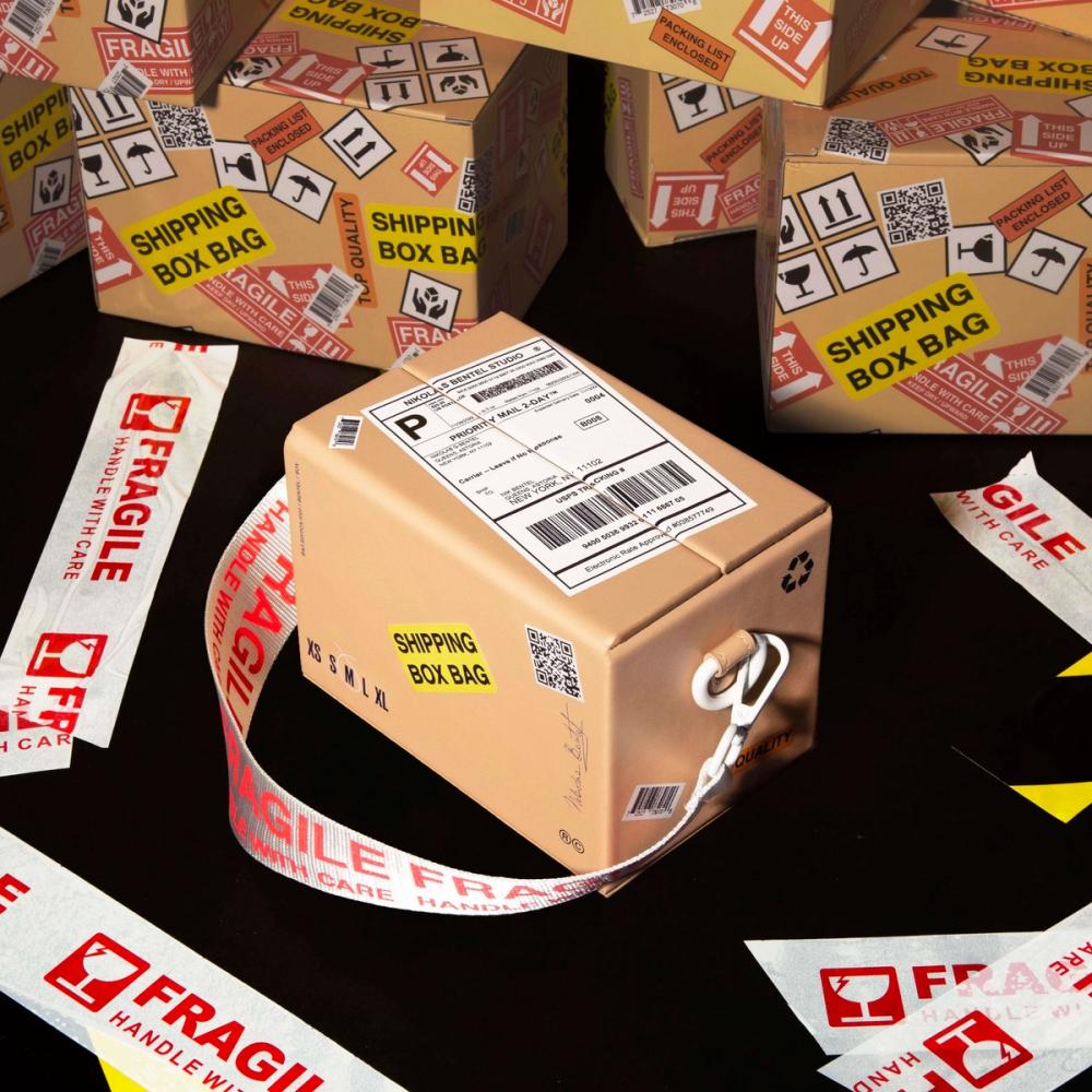 A limited edition vegan leather handbag, inspired by your everyday shipping box. There are two bag options. You can either purchase a bag with pre-printed UV stickers or purchase a blank bag which comes with a pack of vinyl stickers so you can customize your bag however you like. The bag size is 4”x 4”x 6”.