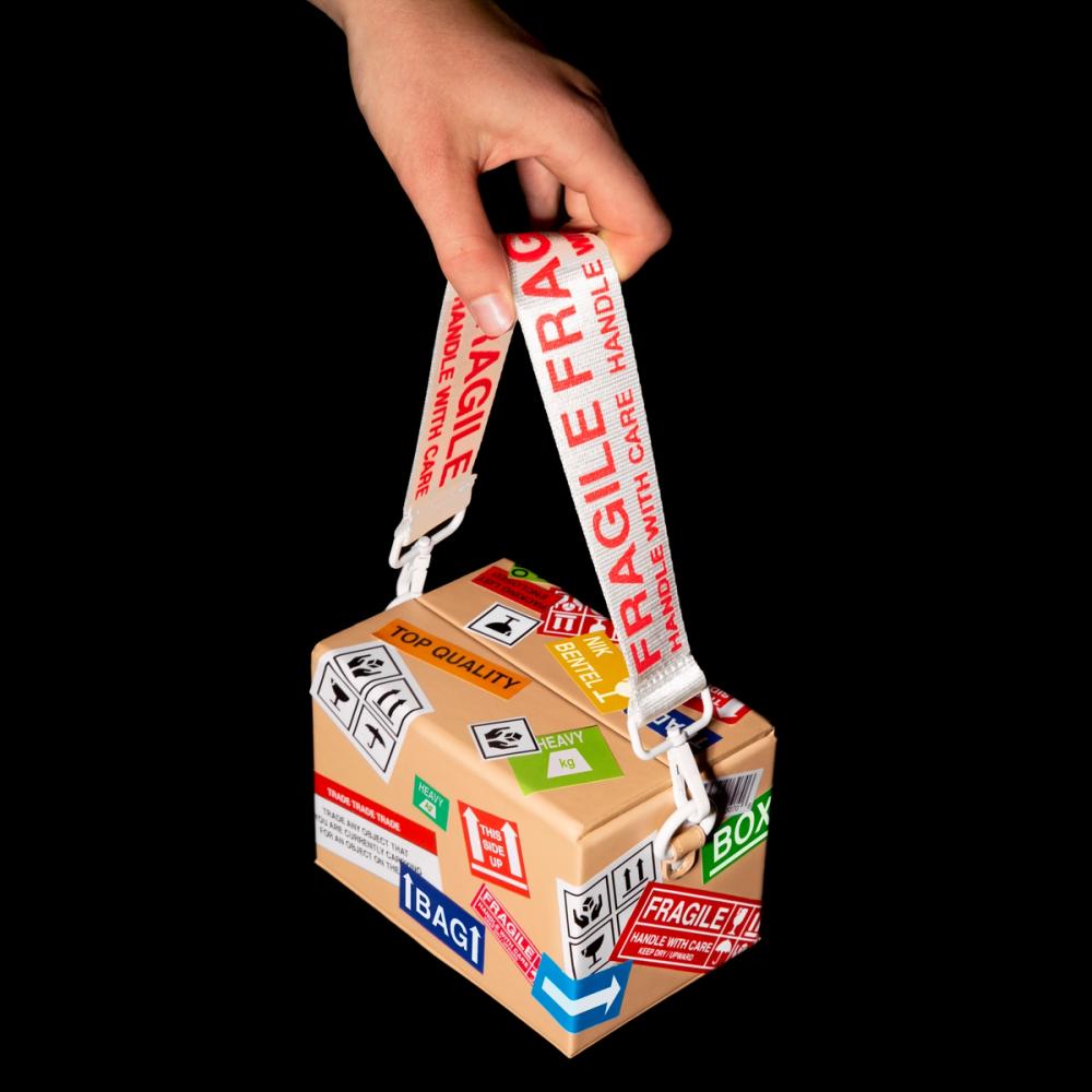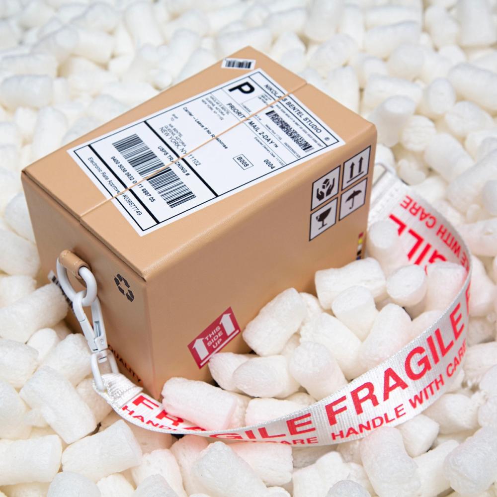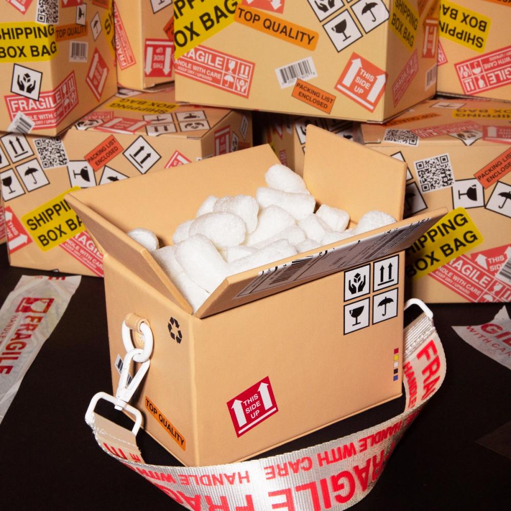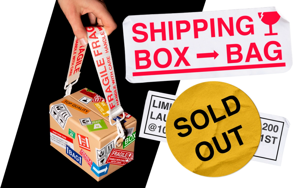 A limited edition vegan leather handbag, inspired by your everyday shipping box. There are two bag options. You can either purchase a bag with pre-printed UV stickers or purchase a blank bag which comes with a pack of vinyl stickers so you can customize your bag however you like. The bag size is 4”x 4”x 6”.