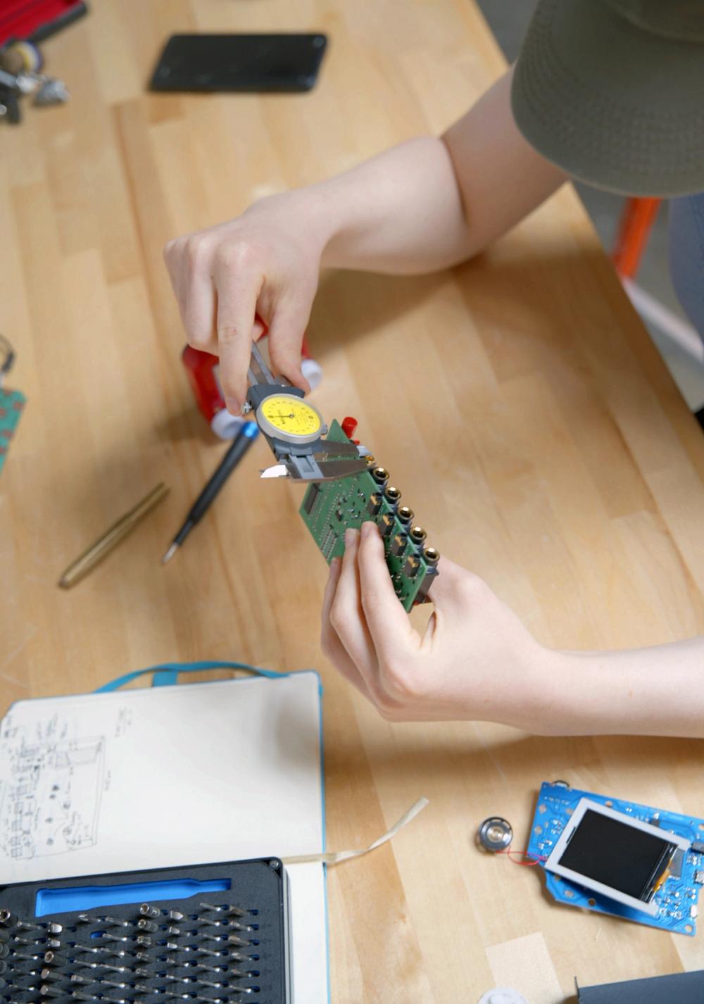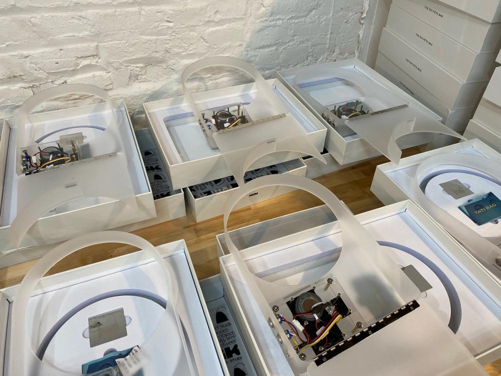 Each bag was made by hand in our studio. They are made from precision-machined colored acrylic, assembled with exposed hardware, and embedded with functioning audio components. The transparent shells allow you to see the internal wiring and construction — a nod to circuit bending and experimental synth design. Shout out to our technical director on this project, Swan Carpenter, for their custom hardware and circuit design.