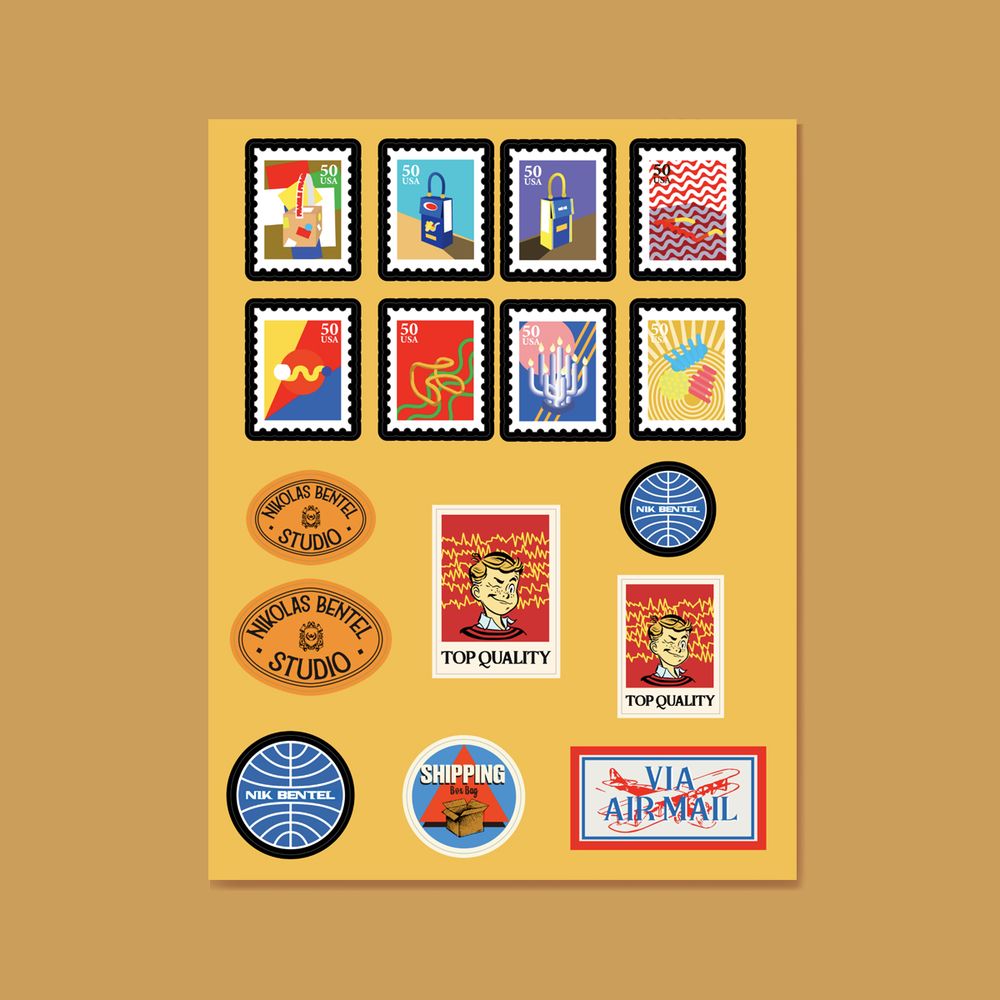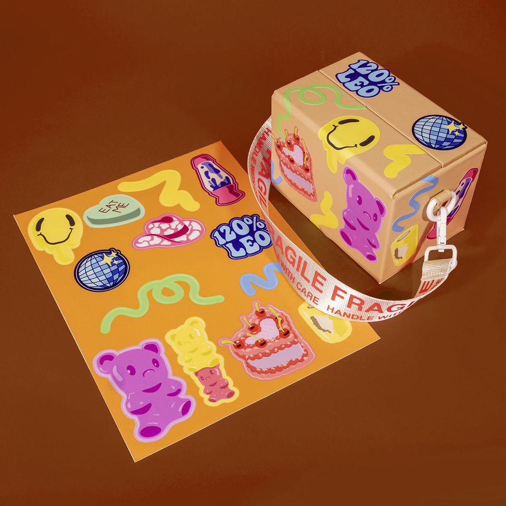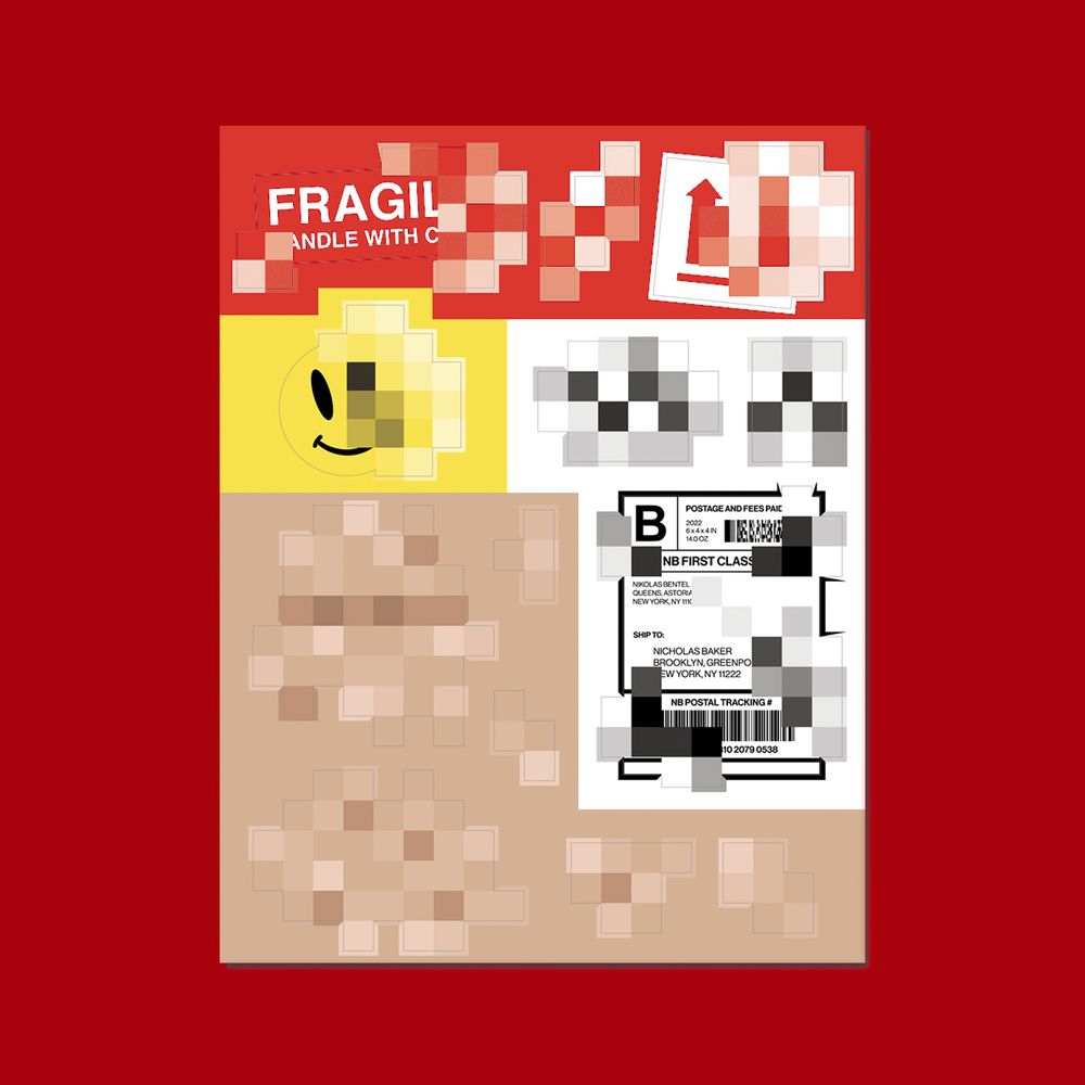 OCT 2022 A blank, fully-customizable Shipping Box Bag featuring stickers by artists Nicholas Baker, Nik Bentel, Alex Kiesling, Dani Klarić, Tay (BeepBoop) Nakamoto, Yuliya Veligurskaya.
