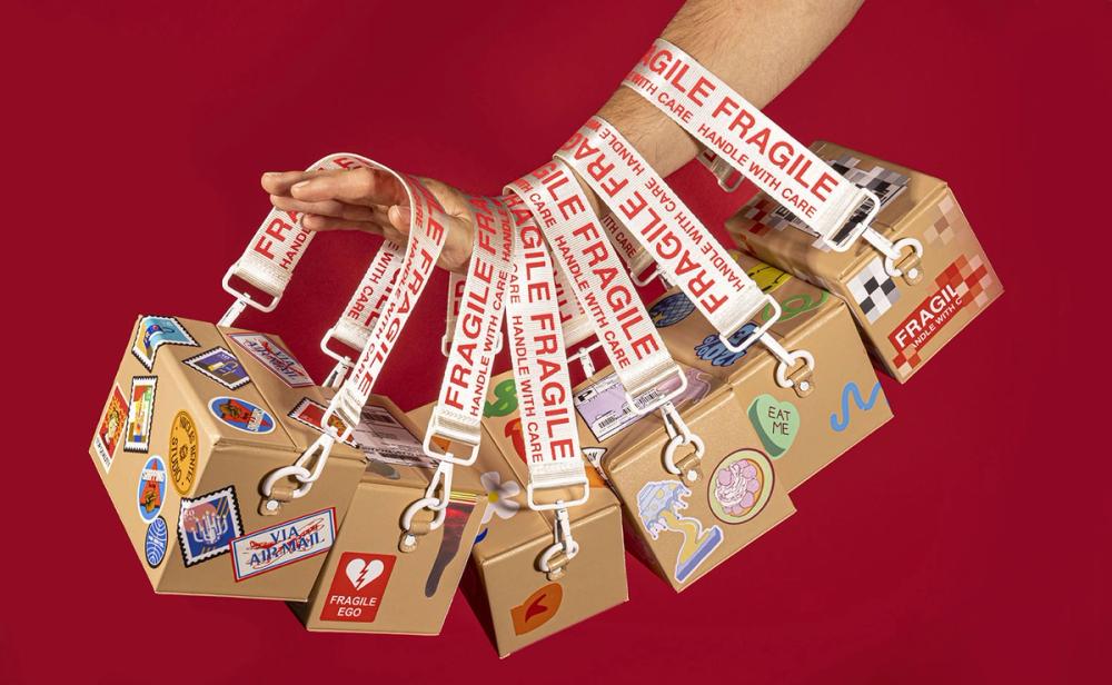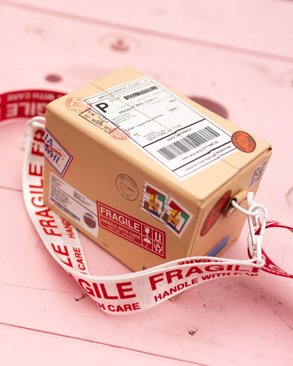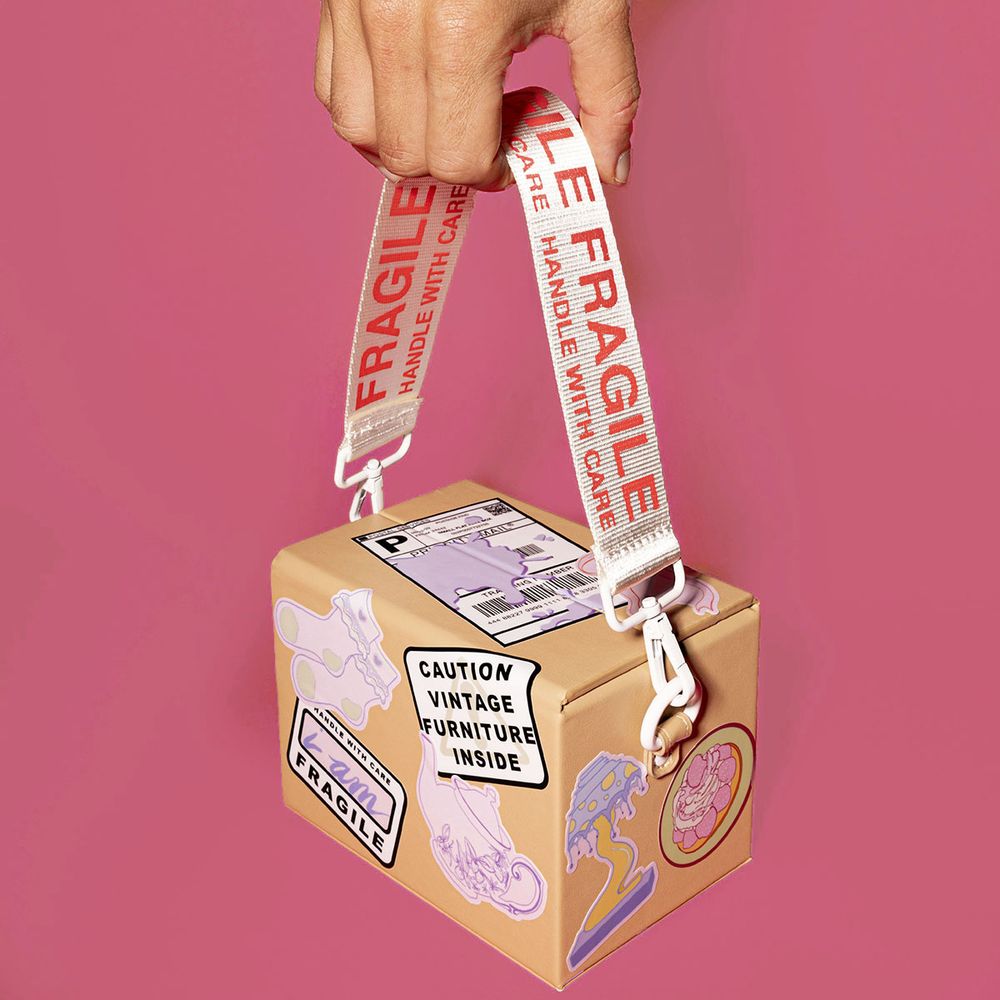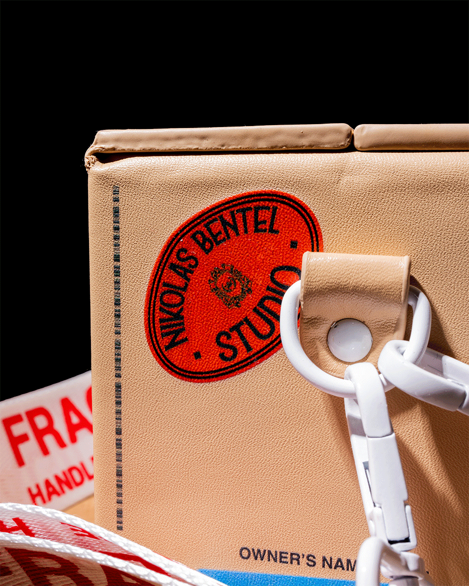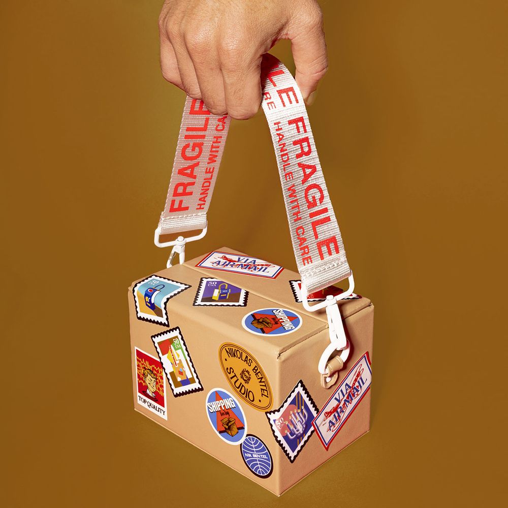 Making The Shipping Box Bag took many iterations, particularly figuring out the closing mechanism and the perfect texture for a soft but sturdy form. We made a nearly true-to-life reference to a real cardboard box, and for us that's a success.