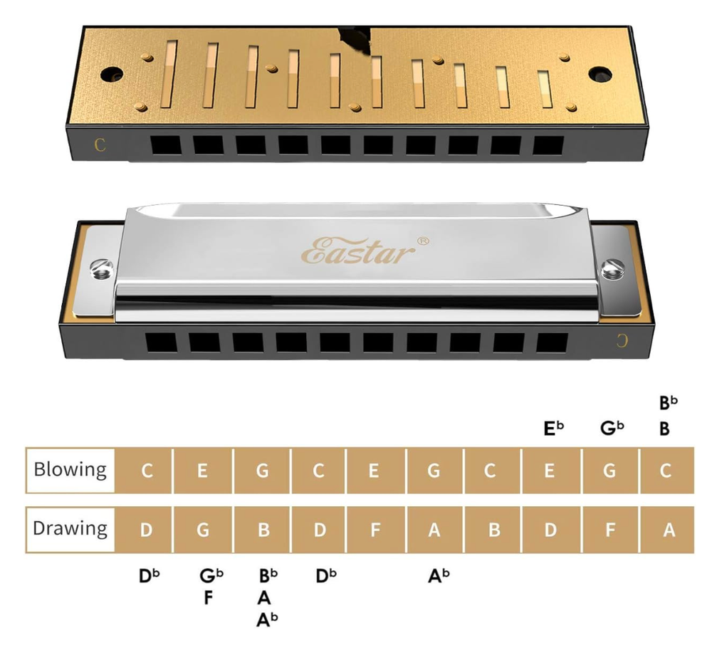 The Ball harp is pitched in C and can play a range of one octave. Using both hands you can play any combination or all of the 8 notes! Simply place your mouth over the mouth piece and cover all the holes with your fingers.