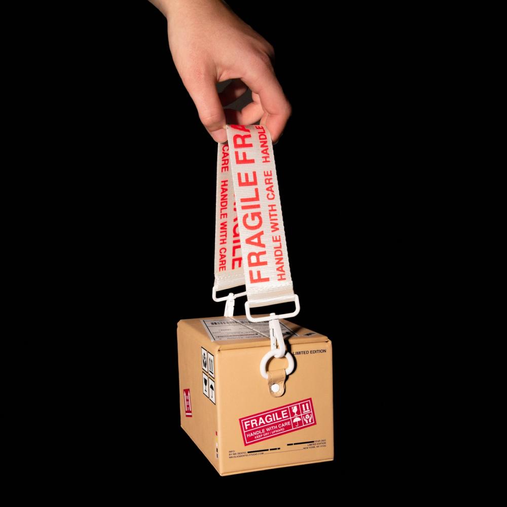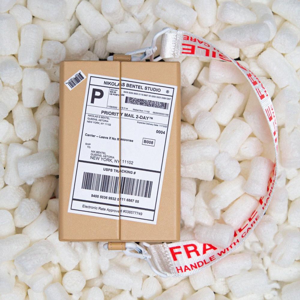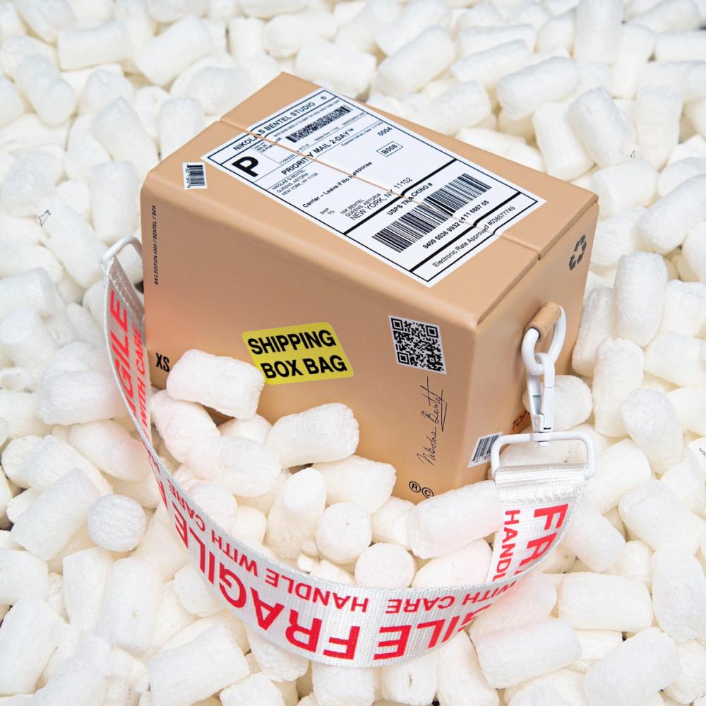 A limited edition vegan leather handbag, inspired by your everyday shipping box. There are two bag options. You can either purchase a bag with pre-printed UV stickers or purchase a blank bag which comes with a pack of vinyl stickers so you can customize your bag however you like. The bag size is 4”x 4”x 6”.