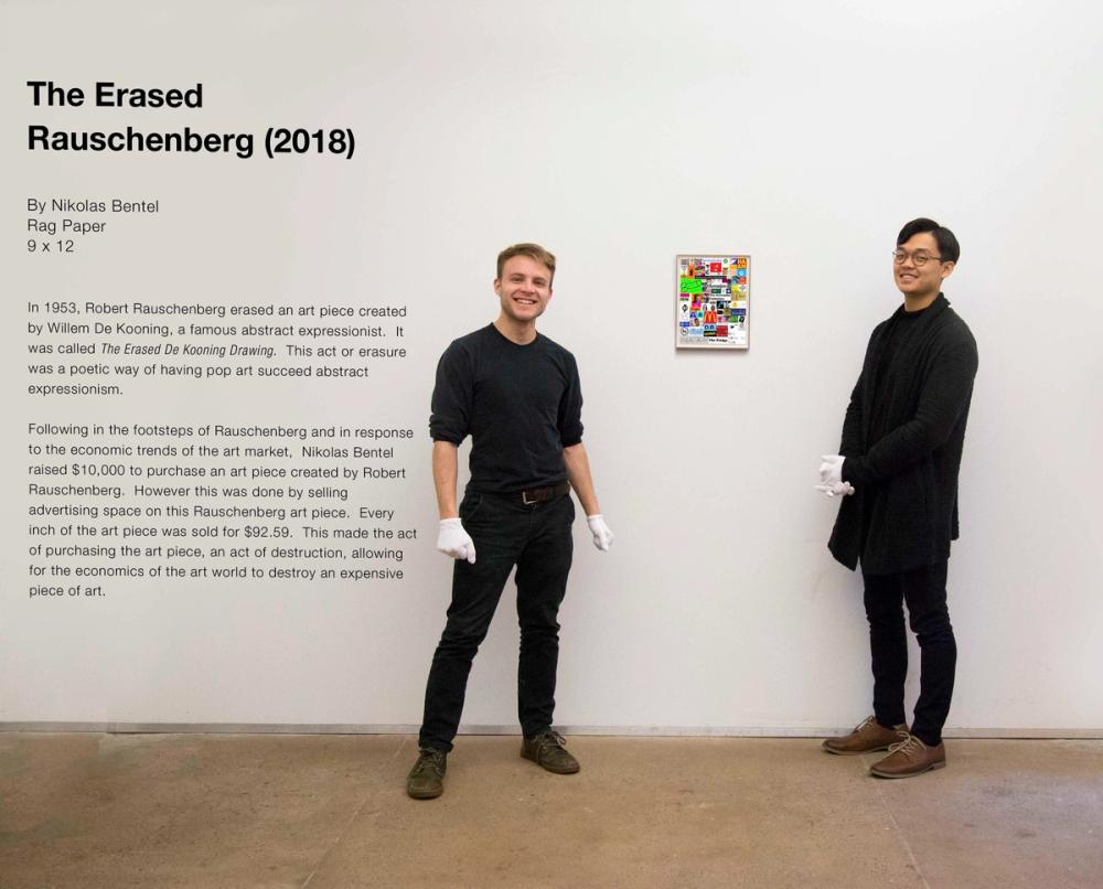 In 1953, Robert Rauschenberg erased an art piececreated by the abstract expressionist Willem De Kooning. Rauschenberg called the piece “The Erased De Kooning Drawing.” This act of erasure was a poetic way of having pop art succeed abstract expressionism. Following in the footsteps of Rauschenberg and in response to the economic trends of the art market, Nikolas Bentel raised $10,000 to purchase an art piece created by Robert Rauschenberg. Bentel raised the sum by selling space on the Rauschenberg piece as advertising space. Each square inch of the art piece was sold for $92.59. This made the act of purchasing the art piece, an act of destruction, allowing the economics of the art world to destroy an expensive piece of art. To complete the economic circle and create value from the erasure, Nikolas Bentel partnered with the New Museum to auction the art piece off starting at, 20,000 USD, twice its original value. The piece was sold for 21,000 USD to the Schroeder Collection in London. The proceeds were given to the New Museum, creating a scholarship fund for artists who were accepted to be a part of the New Museum residency program, New Inc.