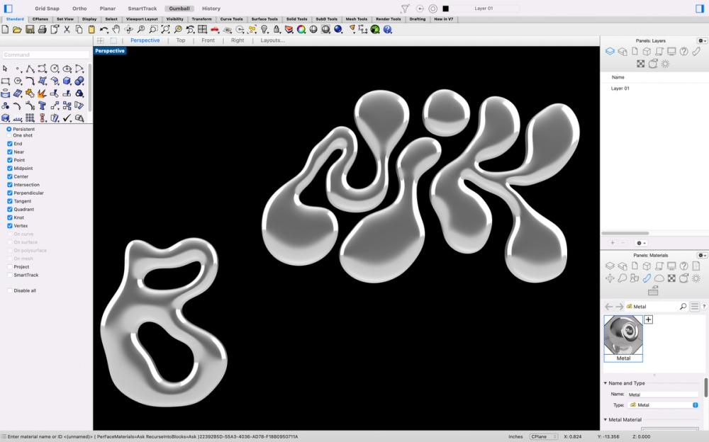 The bag's custom metal hardware was designed using Rhino, while the fabric is crafted from stitched vegan leather.